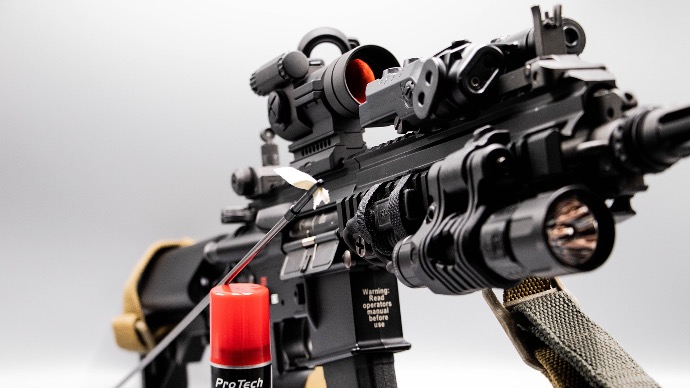 b. Use a small brush to lubricate the spring guide, the inner grooves of the slide and the inner grooves of the handguard with a small amount of Teflon gun grease.